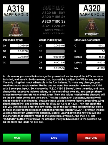 The App A320 WB Weight and Balance was created for the purpose of training, and works with AHM-560 calculations formula and is be used as an Weight and Balance Educational Tool. The app includes: three versions for the A319 and four for the A320, and three for the A321. If any of those preset versions does not match your aircraft, you can always use the configuration menu and adjust the pax and cargo indexes to match the ones you need. The fuel indexes are not changeable but are the most standard ones.