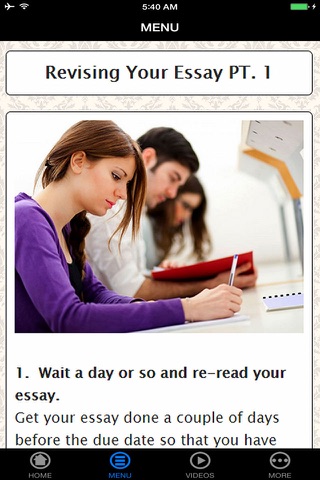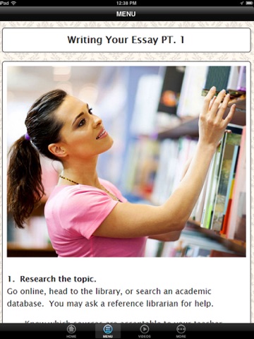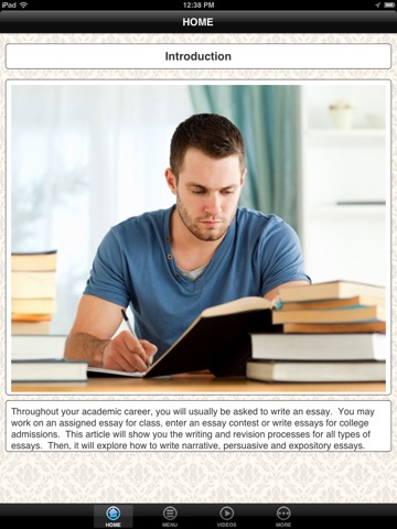 Throughout your academic career, you will usually be asked to write an essay. You may work on an assigned essay for class, enter an essay contest or write essays for college admissions. This App will show you the writing and revision processes for all types of essays. Then, it will explore how to write narrative, persuasive and expository essays.