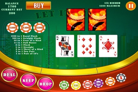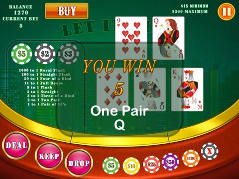 Play 5 card poker with 3 rounds of betting. Is your hand worth keeping or dropping? Place 3 bets and decide after community cards are turned over if your bet needs to be changed.