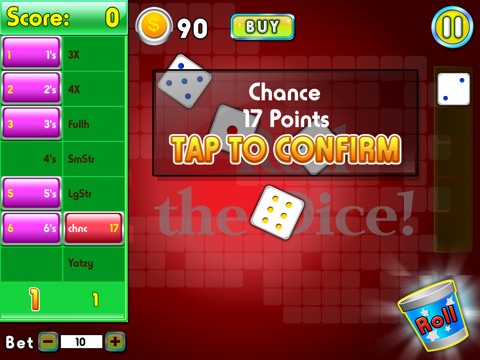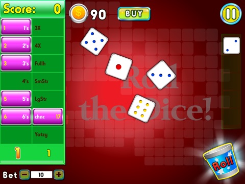 Test your skills in 13 rounds, with 3 rolls per hand. Winner scores by creating the best poker hand: 3 of a kind, 4 of a kind, straights, and so on…