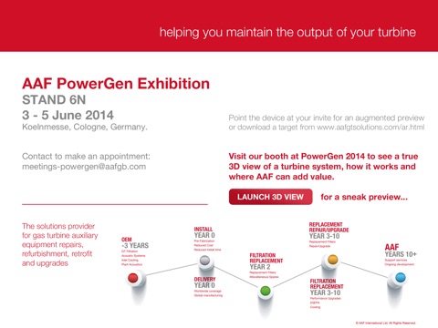 AAF International Powergen AR Experience. Get a taster of the Augmented Reality (AR) visualisation you can expect to see on our Stand at Powergen 2014. Simply point your device at the invite or download a printable target from http://www.aafgtsolutions.com/ar.html and experience technical AR at its best!