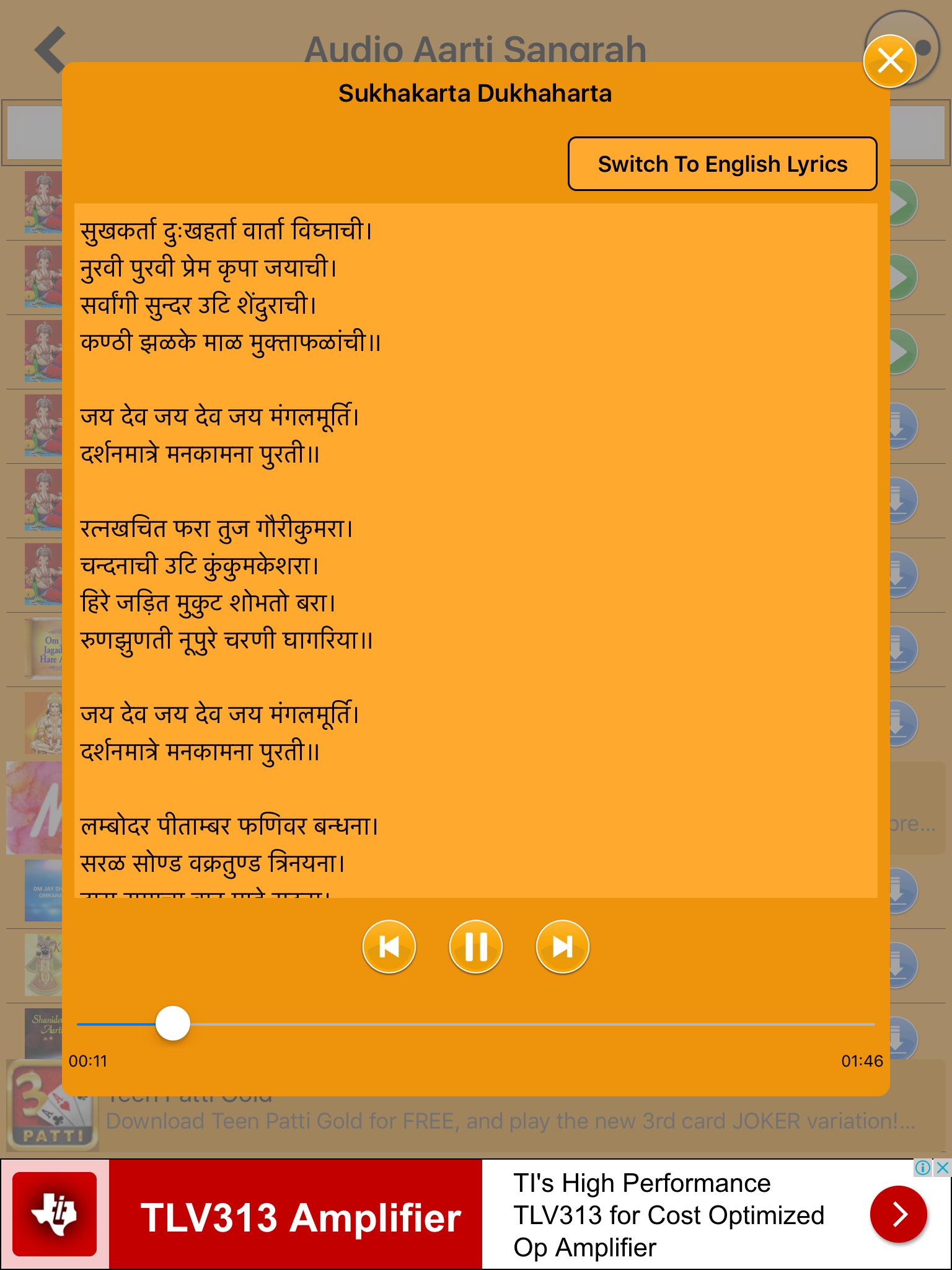 This application contain aarti audio, video, lyrics in Hindi as well as in English. You can view, listen as well as read or sing aarti.