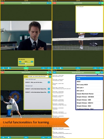 1. the user interface not easy for the ipad -- id like to ask to add finger gesture functions 2. only mp4 files are able to play -- please implement no encoding features so i can easily play *.avi files or other wma and so on.. 3. nice try in lrc and srt sub support but id like to ask for more formats such as SMI or UTF an so on 4. the synced subtitles are appearing at the bottom of the screen -- middle should be more comfy to see 5. user custom subtitle edit function will make this app more useful 6. i believe and invested my money and time on this and the concept of this app is promising