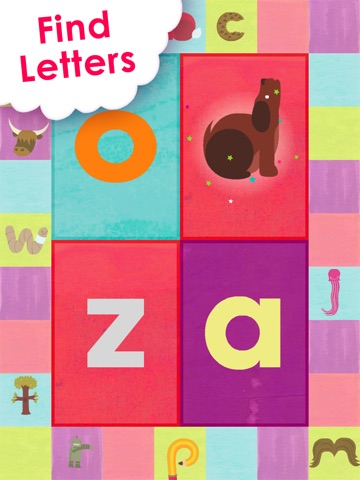 A letter is announced... Can you find the letter from amongst four choices? Once all the letters have been found, theres a reward animation! Incorrectly answered letters are retested for learning.