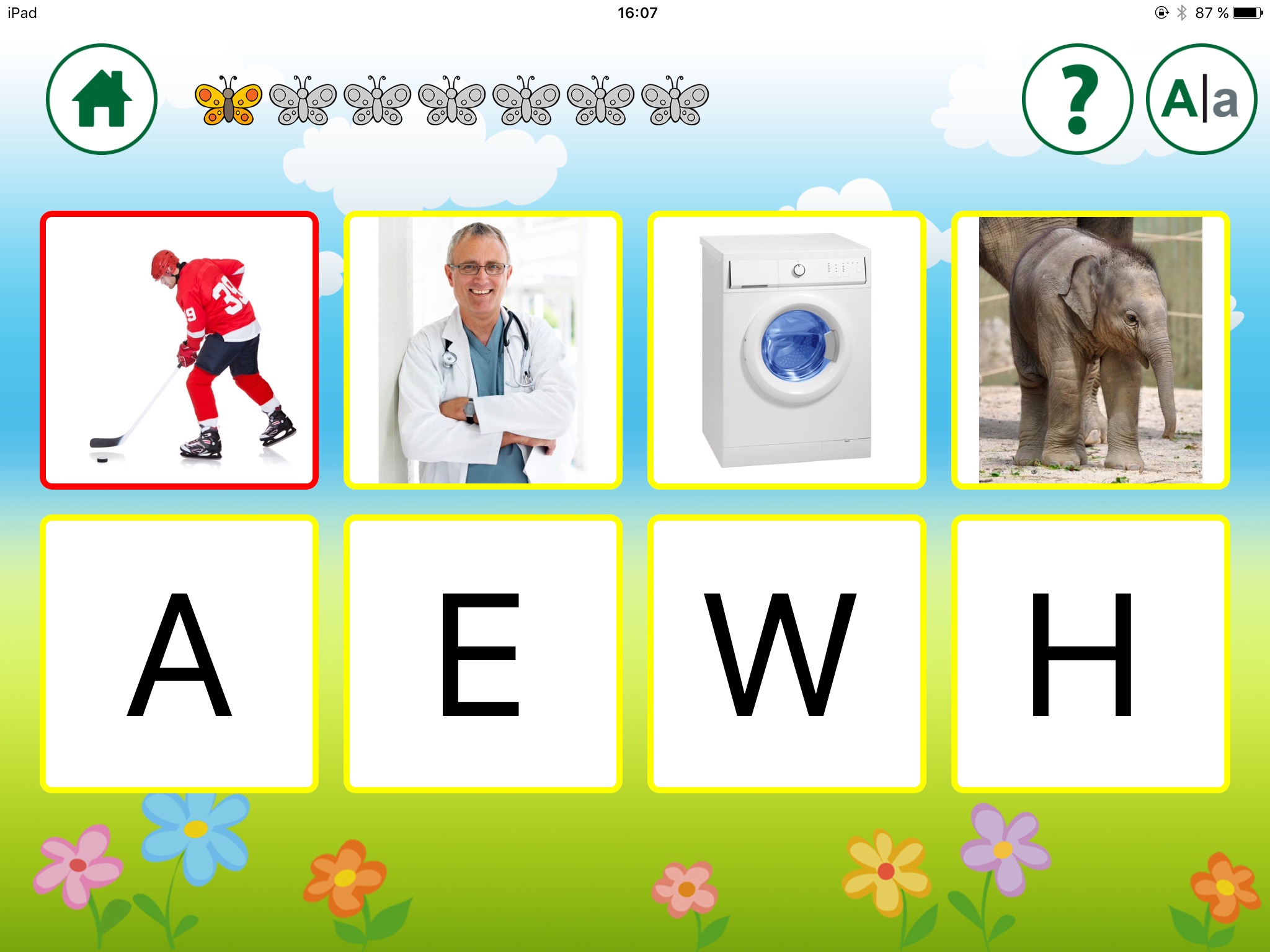 Die Aufgabe besteht darin, den richtigen Buchstaben zu finden, z.B. "A". Es gibt hier die Möglichkeit, einzustellen, ob nur große oder nur kleine Buchstaben erscheinen sollen oder beide Varianten.