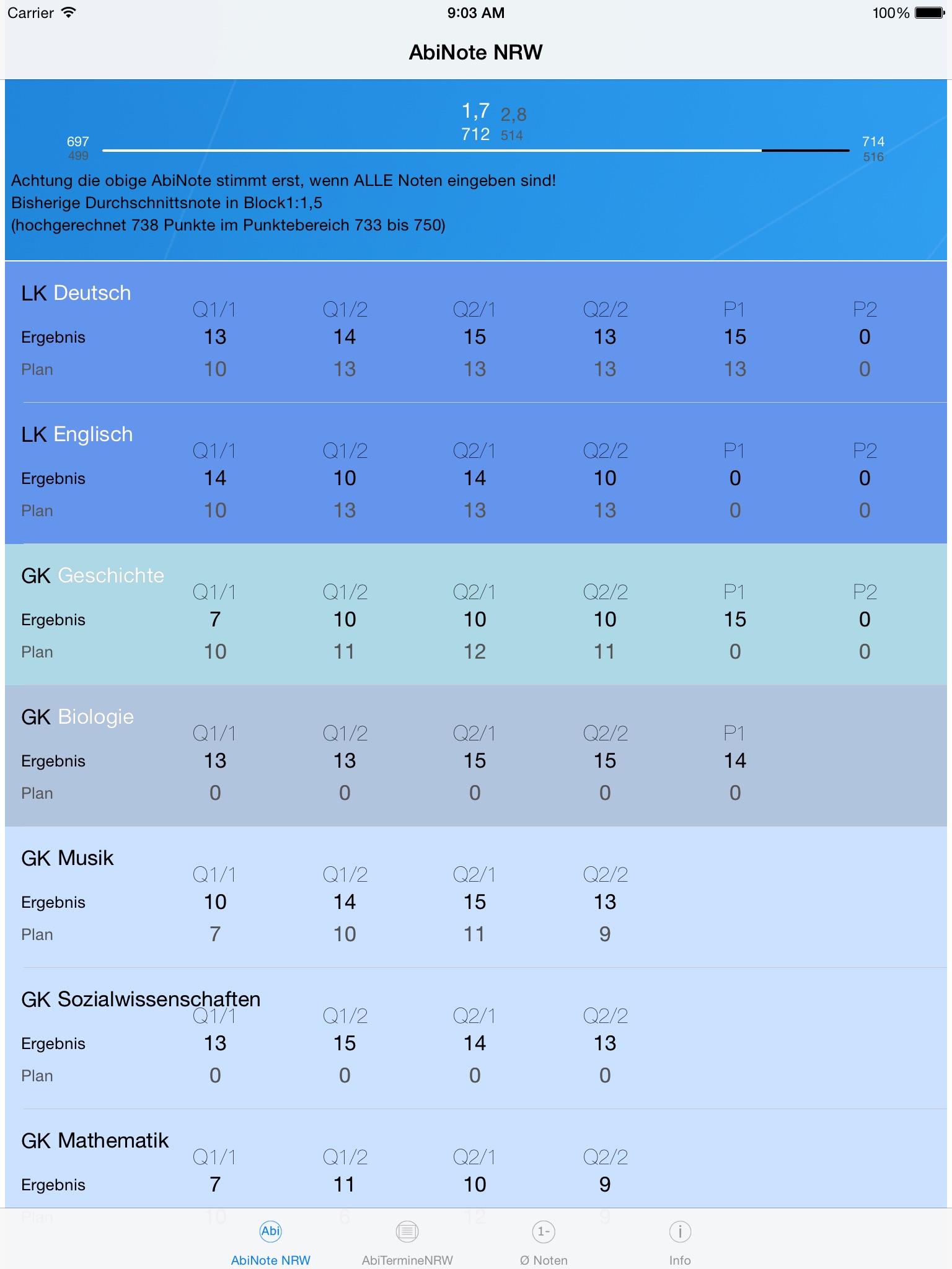 Achtung: Die richtige Kursbelegung wird vorausgesetzt. Neben der Eingabe der bisherigen Noten besteht auch die Möglichkeit zusätzlich und separat Planwerte einzugeben (Damit ihr auch seht wo ihr rauskommt ;-)