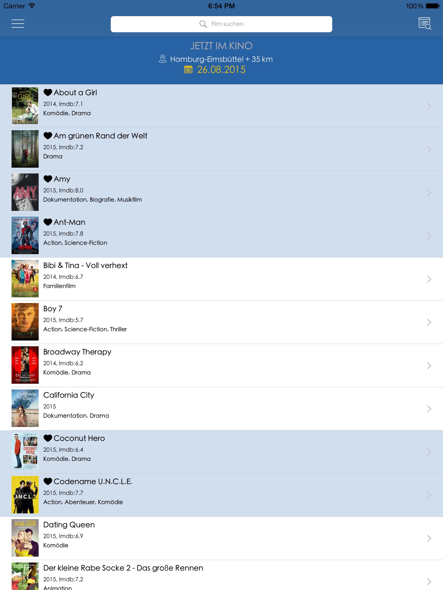 - Erstellen Sie Ihren eigenen Stadt- und Suchradius und Ihre Favoritenliste (Kinos und Filme)