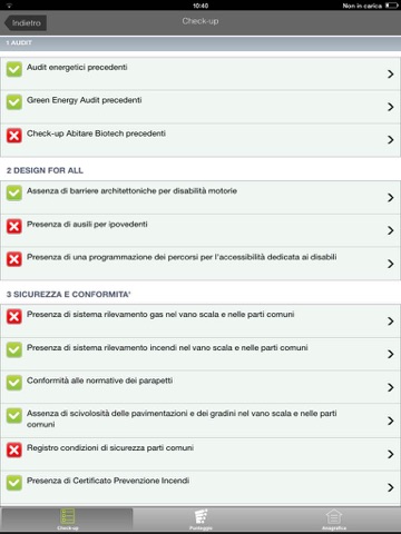 Abitare Biotech permette la compilazione del Check-up Abitare Biotech, realizzato in collaborazione con docenti del Politecnico di Milano, costituito da 89 requisiti che rappresentano le varie componenti che contribuiscono, nel loro insieme, a garantire qualità, benessere, comfort, economicità e sicurezza dell’edificio.
