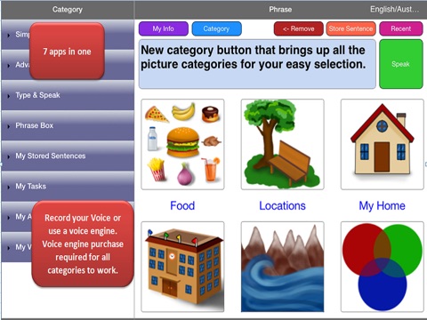 If you dont want to pick pictures to form a sentence, no problem,you can type. First buy a high quality voice engine powered by Acapela. There are over 79 HQ voice engines to choose from. Check out some samples in My Audios. We also included some fun voice engines like Queen Elizabeth, Will (little creatures), Will(scary guy), Saul (hip hop ), Micah (Texas cowboy) and Will (upclose). Pick a engine, type a sentence and press the green speak button. You can modify voice speed and voice shaping. Voice engines say the darndest things sometimes so we also included a pronunciation word replacement system.