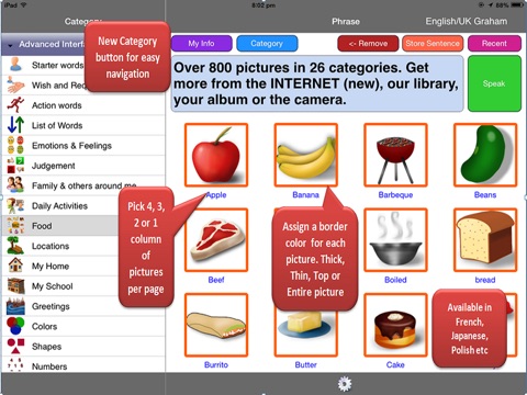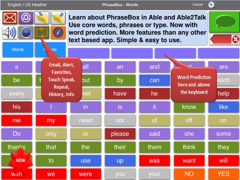 * Create a sentence using 150 core words with 620 fringe words available. Voices have been deactivated for this app.