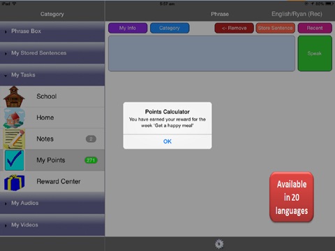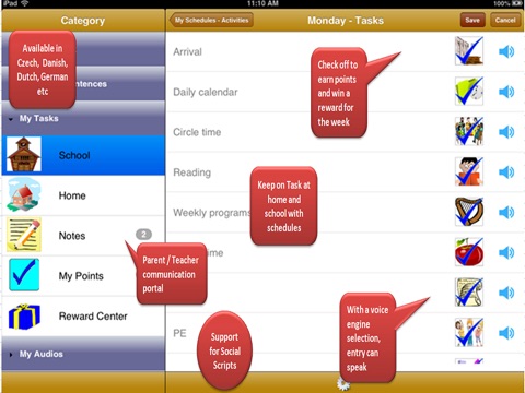 * Home and school - itemized daily schedule to help the individual stay on task and motivated. When a entry is check, points are added to the weekly total. When a threshold is reached the individual can get a reward. (to see how this works go to My Tasks, school, My schedules, touch and check the red Tuesday pic, all the sub activities under Tuesday will be checked automatically, then save. My points should change within 4 seconds)