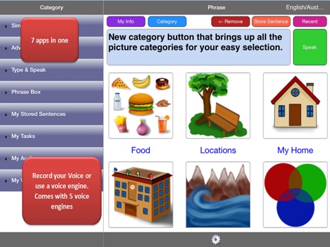 Form a sentence by touching the appropriate pictures. Pictures organized in 26 categories like action words, family and friends, food, shapes etc to name a few. All pictures/text are placed alphabetically in each category.
