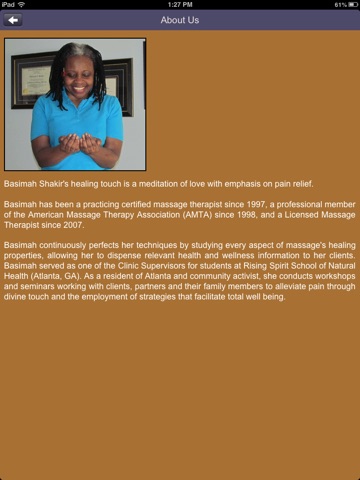 Your Therapist, Basimah healing touch is a meditation of love with emphasis on pain relief. She has been a practicing certified massage therapist since 1997, a professional member of the American Massage Therapy Association (AMTA) since 1998, and a Licensed Massage Therapist since 2007; specializing in therapeutic massage and pain relief, utilizing different healing techniques from a holistic point of view.