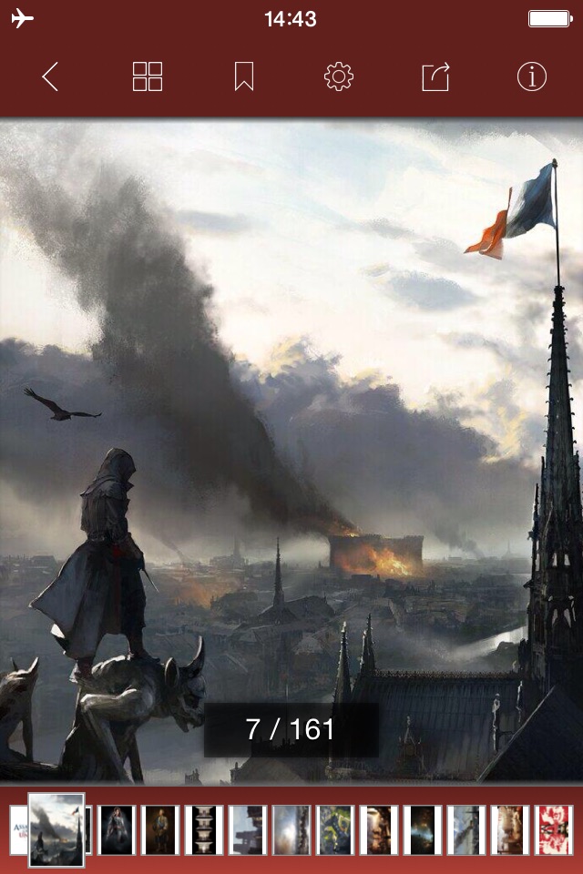 Oui en effet de beau artwork dassassins creed , mais jai supprimer lapplication immédiatement car impossible de les regarder convenablement car il y a des pubs sans cesse qui gâche tout !!!! Dommage !