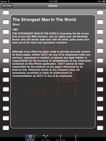 Canadian films past and present at your fingertips! Get information, including synopsis and showtimes of Canadian films playing in your neighbourhood and across Canada, and search through Genie Award nominated and winning films, including features, documentaries, shorts and animated films, all FREE on your iPad.