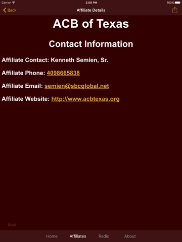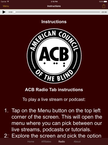 3) Easily and conveniently connect to the state and special-interest affiliates of the American Council of the Blind via the apps affiliate tab