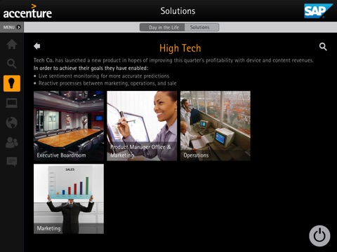 Accenture and SAP have a long history of innovating together. Our latest efforts extend across the global network of Accenture Innovation Centers for SAP Solutions, where we are building the next generation of advanced analytics, mobility, cloud and core ERP solutions with our clients. You can take a look at a comprehensive suite of technology framed in context of industry-specific Day-in-the-Life (DITL) scenarios as well as Solution Showcases.