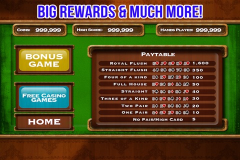 The excitement of 5 Card Draw Poker now at your fingertips! Play wherever you want, whenever you want! With real-life graphics, quick deals and bigger rewards, its 100% poker fun!!!