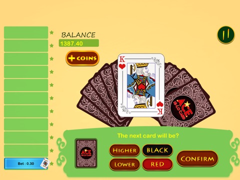 Ace Casino Hi-Lo Card Bonanza features an all time favorite game of hi-lo card game. It 's loaded with millions worth of chips that will get you gambling chills. Guess the next card and win the pot with a single tap.