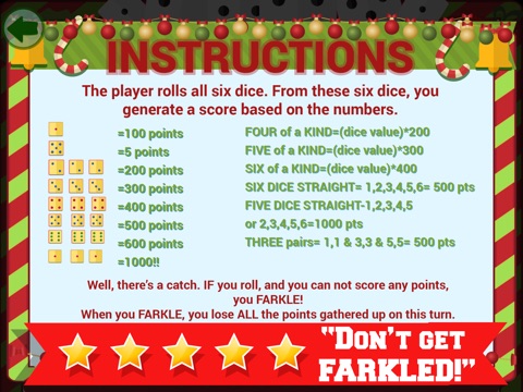 The player rolls 6 dice, and if a valid combination is achieved, the player scores points based on the scoring table (look at instructions screen).