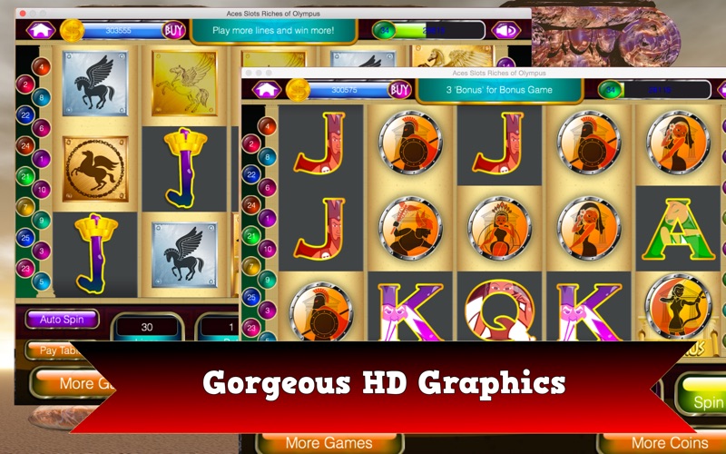 Aces Slots Riches of Olympus is a fun Vegas style 5 reel slot machine with an ancient Greek theme. With gorgeous graphics, this game is fun, easy to play and includes bonus games to bring you real Vegas style fun.