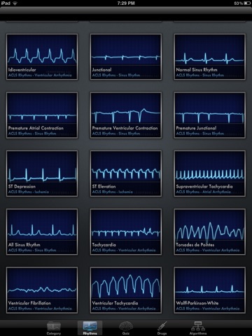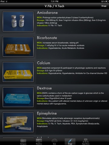 appears to be brand new app so it may get better over time but right now the app closes every time you view one of the videos of a rhythm. Also when taking the "quiz" it freezes and wont allow you to click whether or not your answer was correct or incorrect.... algorithms are neat and up to date with the 2010 AHA guidelines with quick references on the side for good BLS tips and medication amounts/shock joules info. Not sure it is worth $20 though with the current glitches.