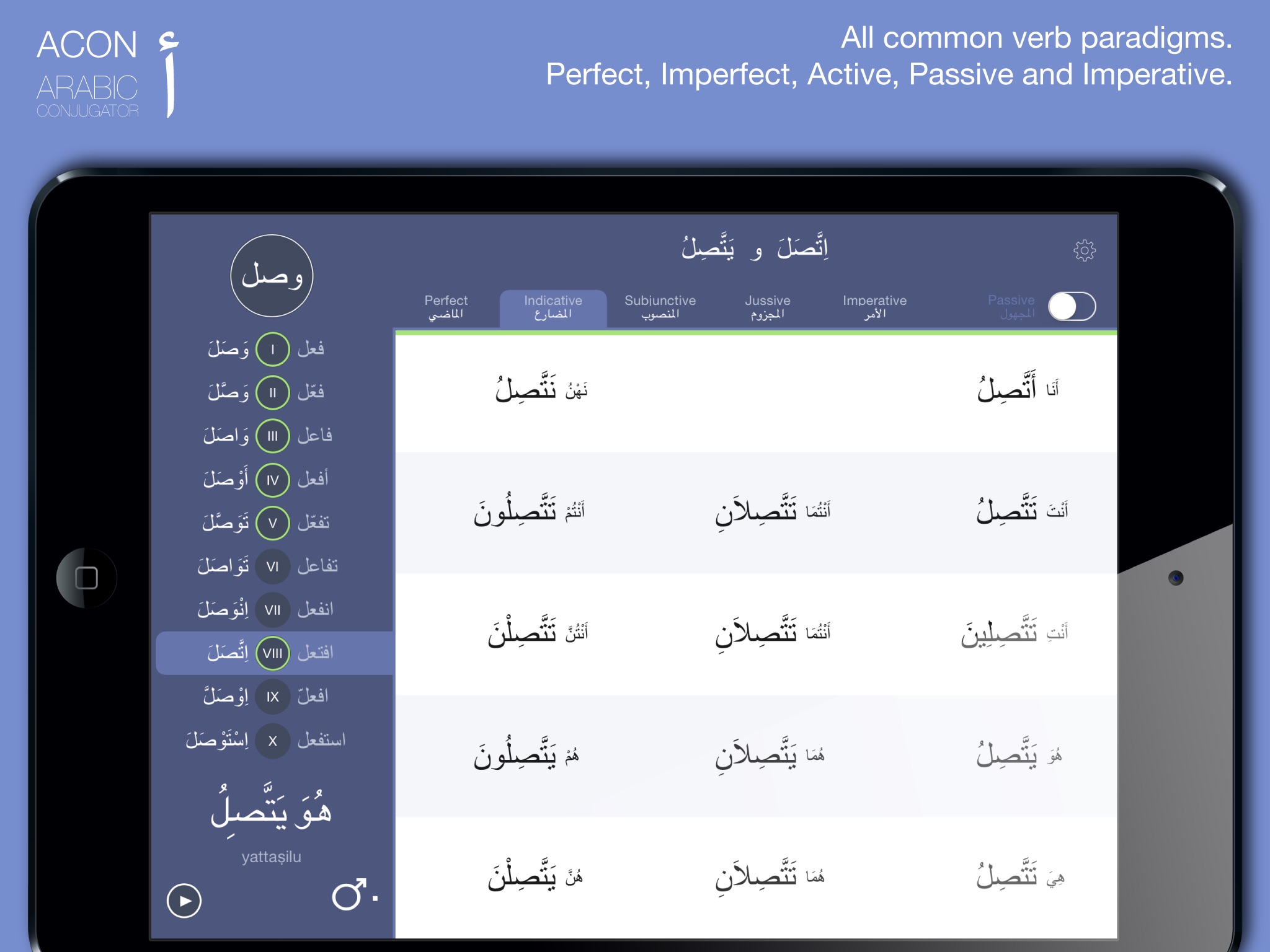 For almost a decade, nearly 200.000 students, teachers, linguists and translators have used ACON as their go-to reference for Arabic verb conjugation. The iOS version offers many more features, including audio pronunciations and more tenses and moods than the web-based version.