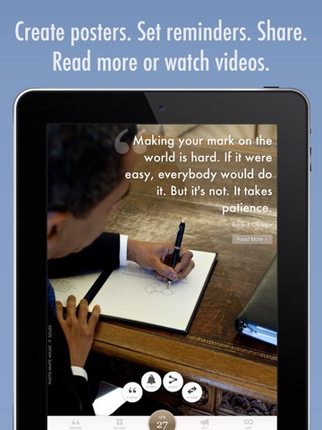 ACT! WITH OBAMA keeps you inspired with daily posters featuring photos of President Obama and his words. Plus, it lets you express support for President’s plan to reduce gun violence by creating and sharing posters with your own photos and messages from the campaign.