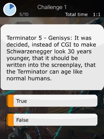 Science Fiction movies are yours? You are a big fan of Arnold Schwarzenegger and the Terminator movies? You know which Terminator Arnold played? You know the subtitle of the fifth Terminator movie and all the story twists? Great! Take a look at this quiz game. This game features hundreds of questions around the Terminator universe including Terminator 1,2,3,4 and 5. Answer ten questions each round and show your knowledge. Have fun!