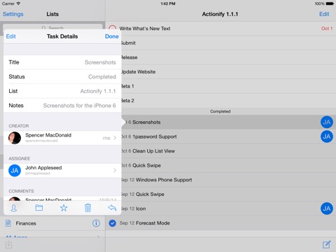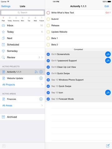 Whether you need to manage a complex project or arrange a childrens party, Actionify can help you organise your Tasks to allow you more time to actually do them. Use Projects and Areas to group Tasks together and add due dates to make sure you prioritise time sensitive Tasks.