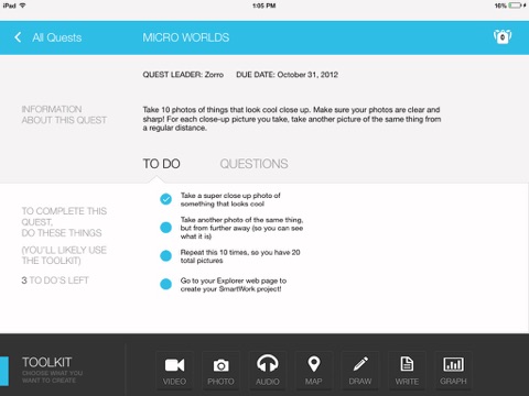 Using the Active Explorer app, kids participate in a Quest by capturing data via photo, video, audio, text, map coordinate, and/or graph.