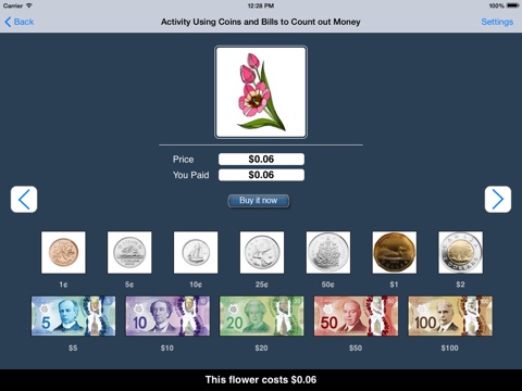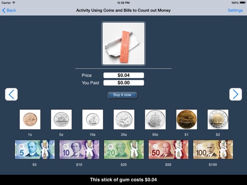 At the top of the screen is an item (say, an apple) for sale. Under the item is the price ($1.50 in this example). Under the price is a counter showing the amount that the student has paid so far. Under the counter is a matrix with coins and bills available to the student. The student clicks on the coins and/or bills to make the counter show the same number as the price shows. When the student thinks the amount is correct, he/she clicks on the “Buy it now" button. If the amount is right, a congratulatory animation appears. If it is wrong, the student must try again.