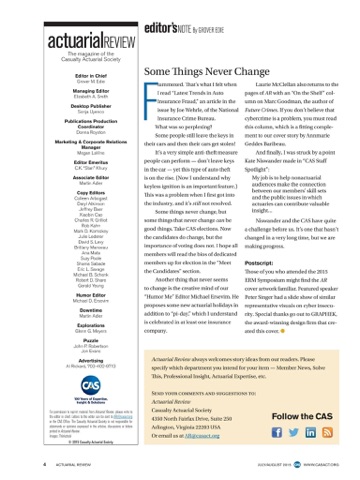 For more than 40 years, Actuarial Review has been the membership news source for the Casualty Actuarial Society. CAS members work for insurance and reinsurance companies and brokers, consulting firms, state insurance departments, educational institutions, and other organizations serving the financial services industry. Actuarial Review is a bimonthly magazine focused solely on property-casualty executives and actuaries.