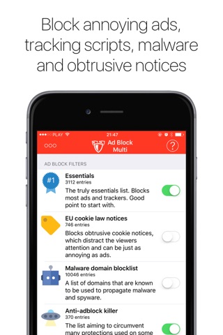 Utilizing the most advanced iOS technology, Ad Block Multi integrates with Safari and applies the combination of filters you select to your further browsing experience.