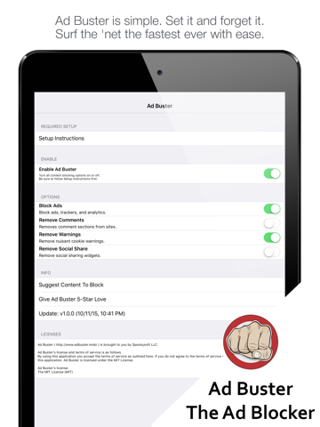 Ad Buster is a content blocker that block ads and pesky content. Its very simple to use and will have you ad-free and without popups instantly!