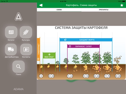 В приложении представлен полный ассортимент препаратов компании Адама для защиты основных культур от комплекса вредных объектов. ADAMA Agricultural Solutions Limited (AAS) (прежнее наименование компании - Makhteshim Agan Industries Ltd.) – Ведущий мировой производитель и поставщик брендовых непатнентных средств защиты растений и других продуктов химической промышленности. Целью компании является развитие рынка защиты сельскохозяйственных культур посредством внедрения новых средств защиты растений и разработки уникальных продуктов и комбинаций действующих веществ. Компания имеет более чем 60-летний опыт работы и безупречную репутацию, благодаря качественной продукции и внимательному обслуживанию своих клиентов.