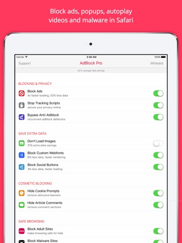 • Our app uses Apple’s native Content Blocking API to feed blocking rules to Safari without accessing your browsing data.