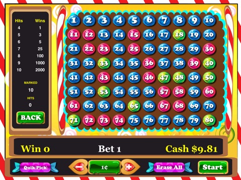 The Candy Keno app offers the thrilling anticipation of chance with each and every play. Watch as the tiles are revealed on the large, color-coded board. Will you get a win, or two, or three, or more? Watch with excitement as your wins and cash value increase with each play. The suspense is so exhilarating!