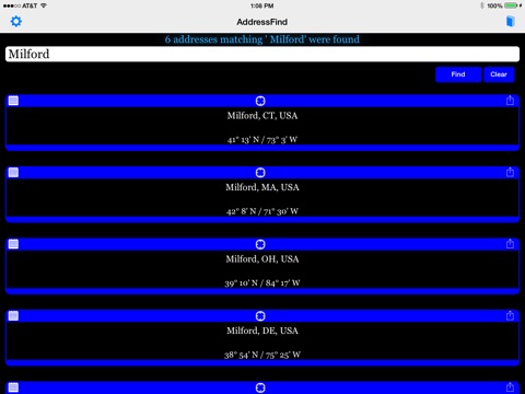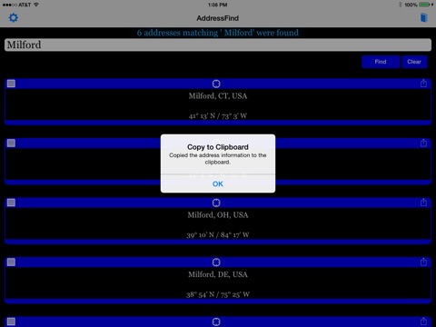 You may then copy any address to the clipboard, display on a map or share using various services such as Email, Twitter, Facebook and more.