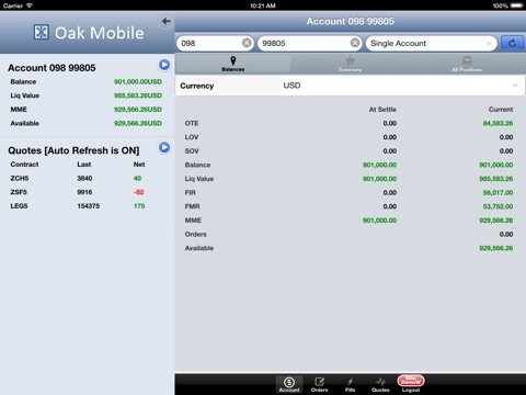 Continuing with the spirit of innovation, Oak Mobile was designed to help traders to access the markets anywhere. Traders can trade and can also retrieve their account and market data information. The OAK System offers a "One Screen Solution", providing customers the ability to route orders to any connected exchange.