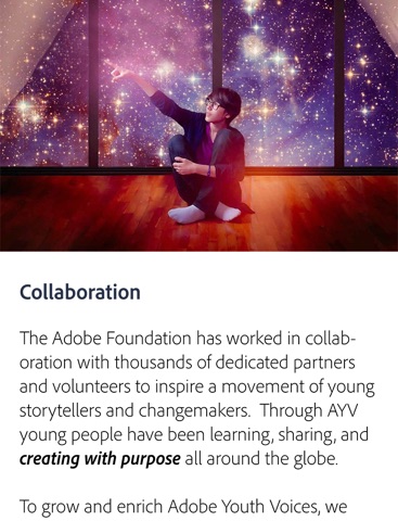 Adobe Youth Voices (AYV) ignites young people’s Creative Confidence—the ability to harness creative skills to solve problems—thereby empowering them to find their voice and make it heard. AYV is the Adobe Foundation’s signature global initiative to increase creativity in education, which is critical to improving the lives of young people today and well into the future.