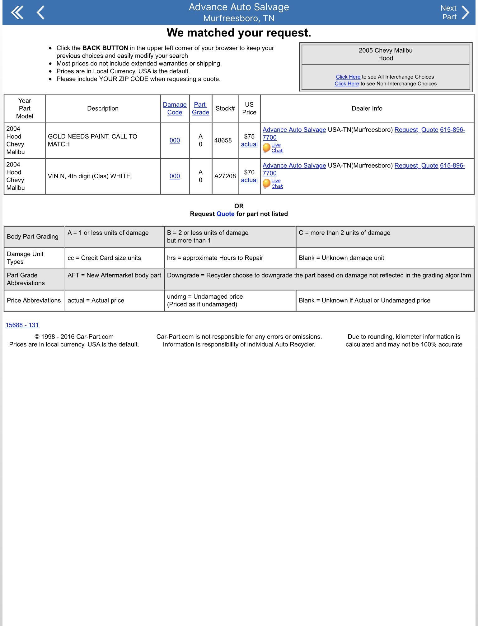 Advance Auto Salvage is a full-service used auto parts facility located in Murfreesboro, TN. Since 2004 we have offered quality used car and truck parts at competitive prices. Nationwide shipping is available and all our used auto parts come with a standard warranty.