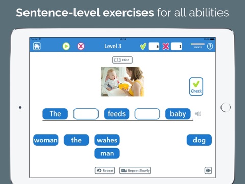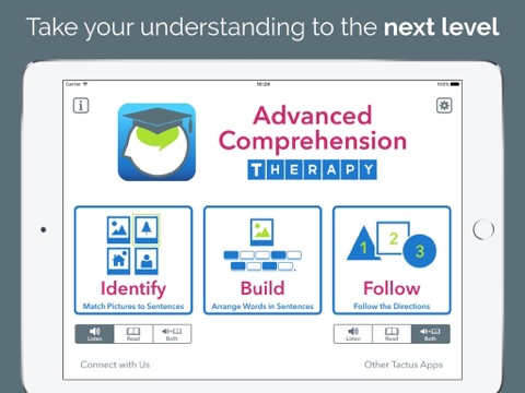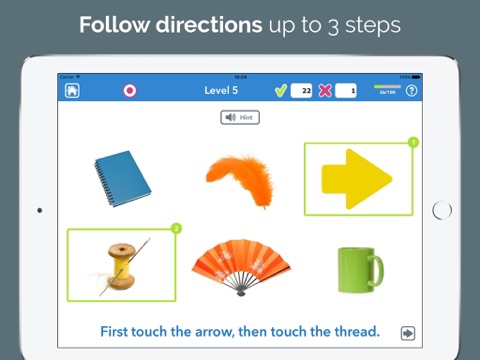 Train your brain to listen carefully with this professional speech therapy app. Three activities help you to understand sentences, follow directions, and improve language processing. If you’re looking for a speech therapy app for adults and older children with communication and cognitive impairments that takes understanding beyond single words, this app is for you.