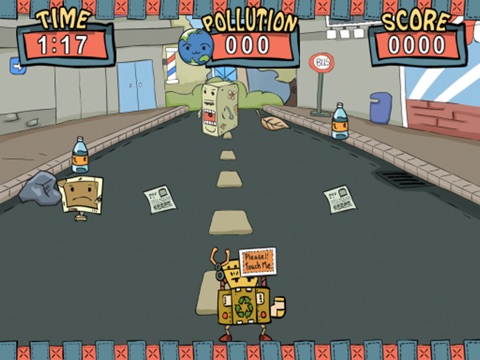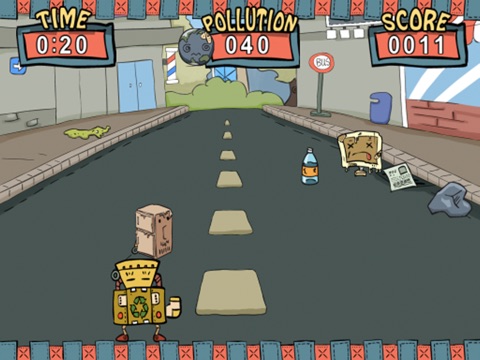 a recycle-robot, has an elastic arm which is used to collect the wastes and put into it’s recycle machine. After recycling, the wastes will turn into valuable material, shining gold coin.