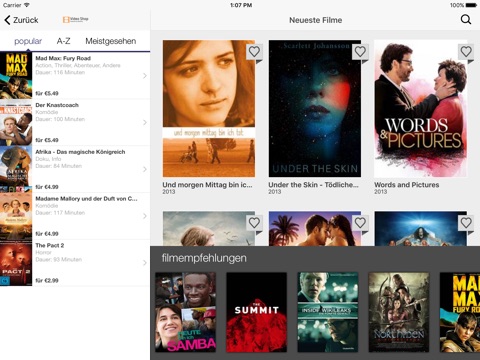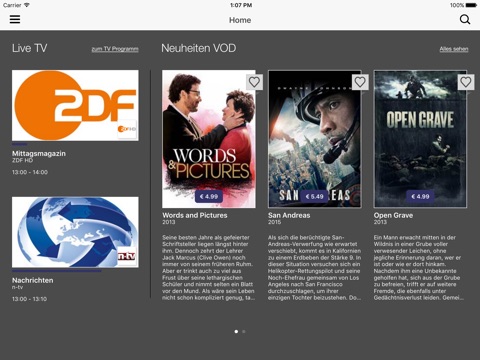 • Abruf von über 50 VoD-Inhalten: Sobald Sie Ihren Wunschtitel aus dem TV-Webportal ausgeliehen haben, können Sie die Filme auf Ihrem iPhone/iPad anschauen