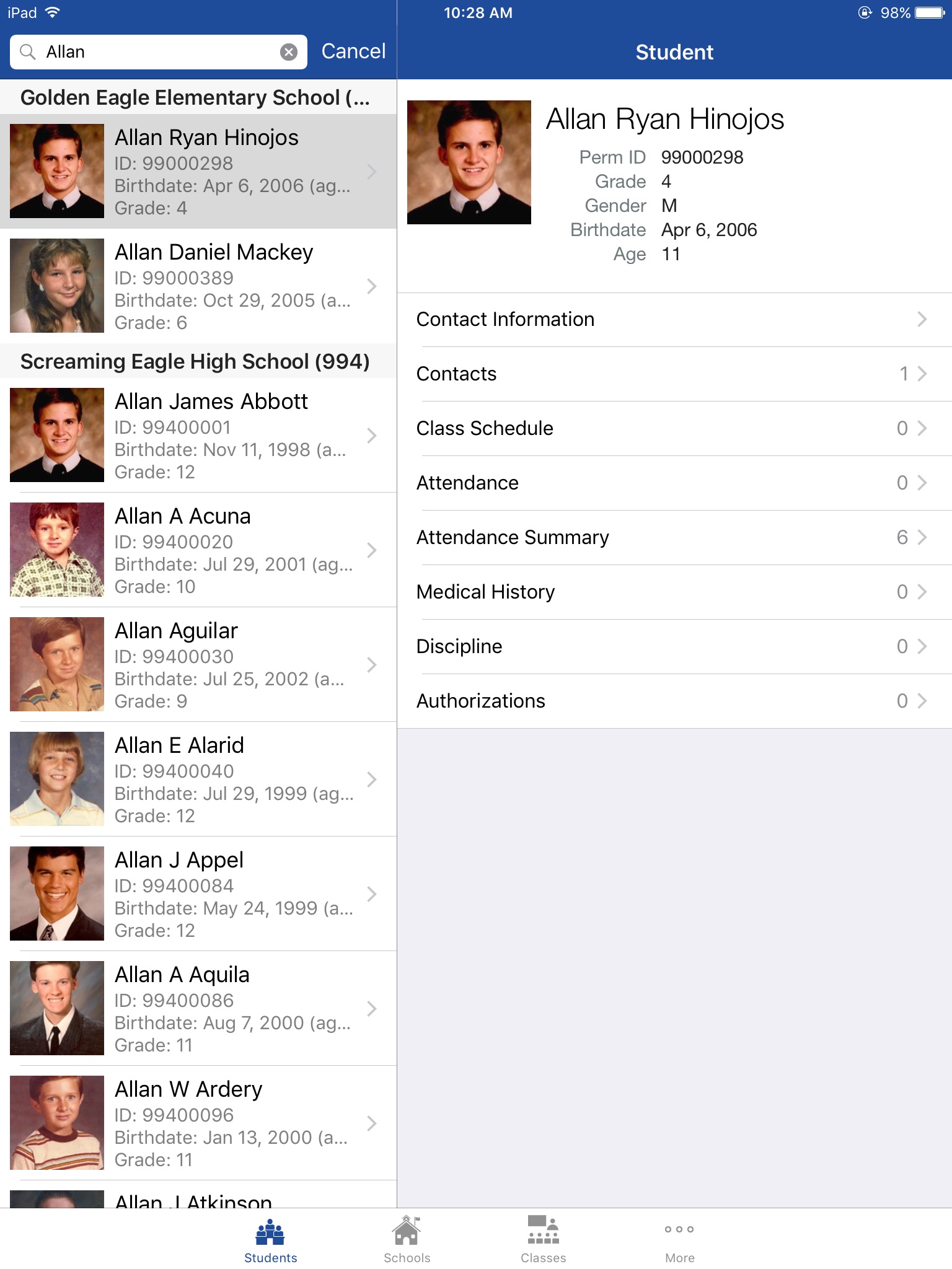 Aeries EM2 provides school-site personnel access to basic student, contact, discipline, medical, class and attendance information. Any of this data can be cached for offline use. This is useful during emergency situations where access to a computer or network is not available.
