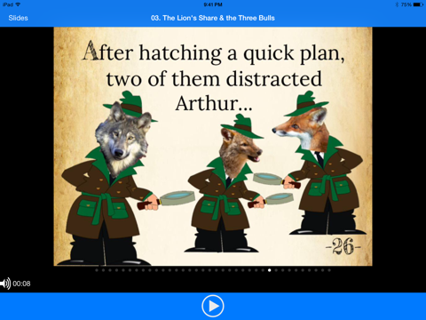 The stories are narrated multimedia picture books that can be played back by kids independently or with an adult and can be read like a traditional story book. Included in every story are 1 or 2 video clips relating to the story. At the end of each fable is a moral (or two), a series of 2 or 3 questions and activities to get children thinking about the stories and interacting with parents and teachers.