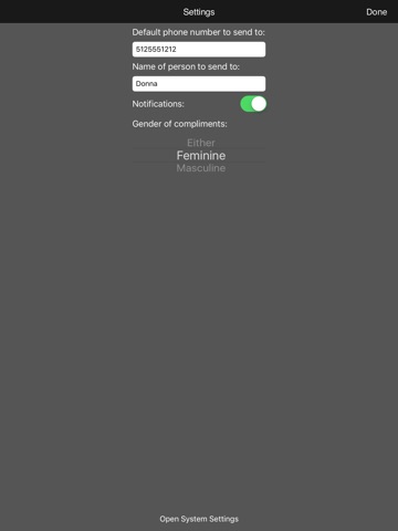 - Settings allow you to enter the default name and phone number for your sweetie pie.