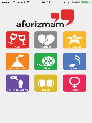 Aforizmam, aşağıdaki 9 kategoriye ait yüzlerce sözü, çeşitli arkaplan, yazı fontu ve yazı rengi ile instagram, facebook ve twitterda paylaşmanızı sağlayan bir özlü söz paylaşım uygulamasıdır. Toplamda 1000e yakın söz bulunmaktadır ve özlü sözlerimiz gün geçtikçe zenginleştirilmektedir.