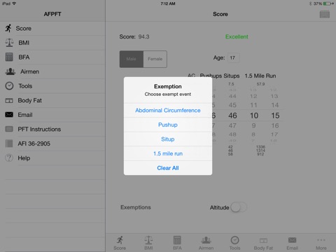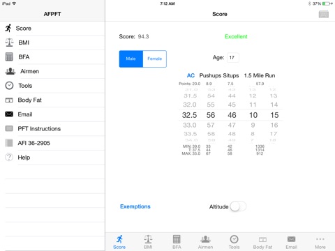 The Air Force Physical Fitness Test (AFPFT) calculator is the ultimate App to gage, administer, and record physical fitness. Individual or multiple Airmens physical fitness can be calculated and stored. The AFPFT calculator even fills out AF Form 4446 in Adobe Acrobat (PDF) or PureEdge (XFDL) format!! The AFPFT uses the latest AFI 36-2905 (Oct 2013) to calculate physical fitness scores and body fat assessment.